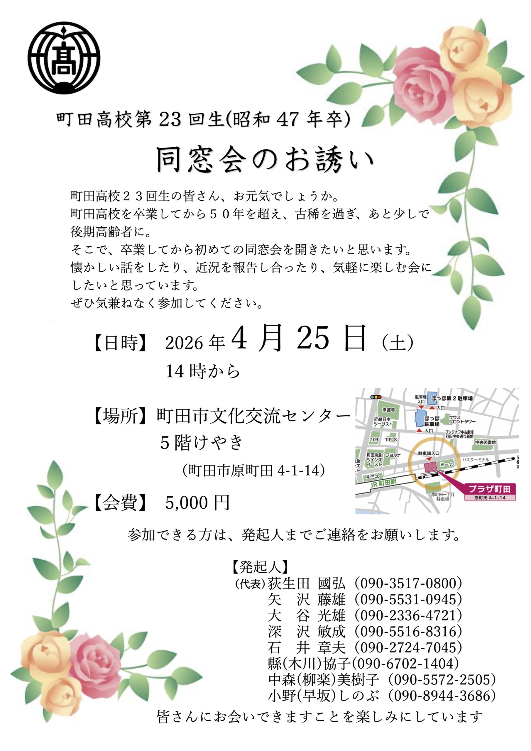 町田高校第23回生(昭和47年卒)同窓会のお誘い